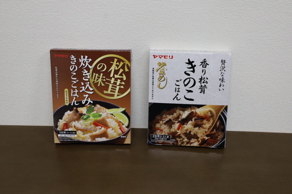 左がリニューアル前の「松茸の味 炊き込みきのこごはん」、右がリニューアル後の「香り松茸 きのこごはん」。