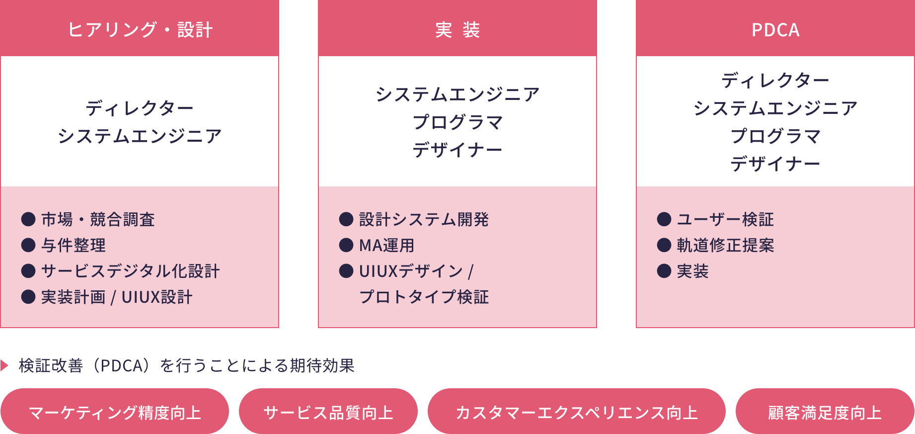 顧客の目的とデジタルリテラシーを鑑み、顧客のマーケットに適応する デジタル・トランスフォーメーション、実装運用を一気通貫でご支援します。