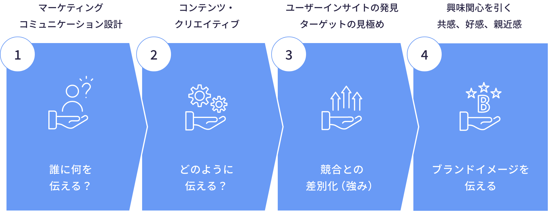 正しいマーケティングができていても、秀逸なクリエイティブがなければ 確実にゴール(施策の目標)まではたどり着きませんのでマーケティングにより導き出した コミュニケーション設計を基にコンテンツ・クリエイティブで顧客を導けるようにします。