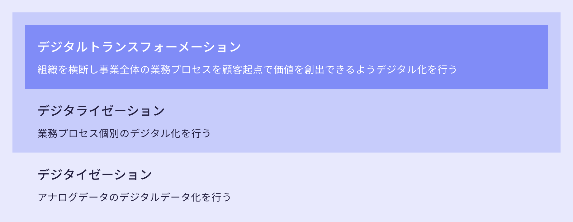 クライアント企業様の行いたいアクションをデジタイゼーション、デジタライゼーション、 デジタルトランスフォーメーションの異なる段階を分解した上で、 クライアントの先の顧客ニーズと、デジタルリテラシーに伴走したデジタル化を設計実装いたします。